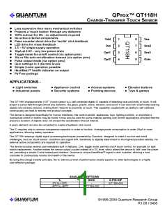 The QT118H charge-transfer (“QT’”) touch sensor is a self-contained digital IC capable of detecting near-proximity or touch. It will